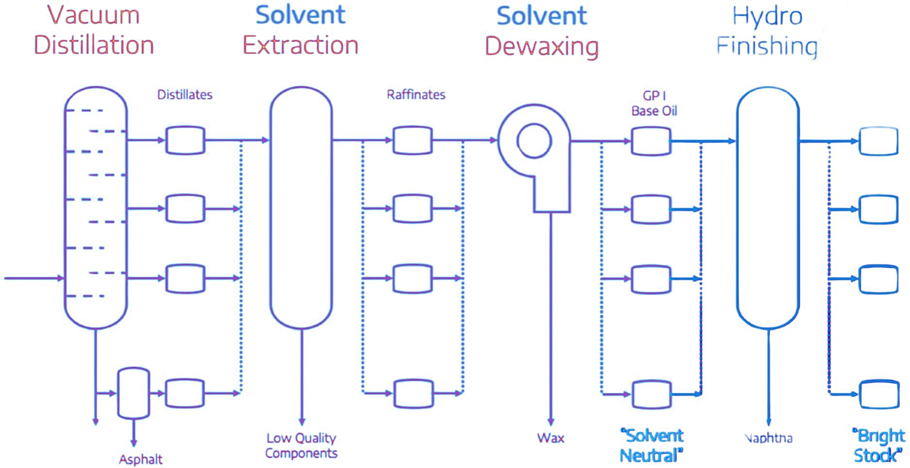 This three-stage solvent refining route produces Group I base oils with 60-85% saturates, 0.2-0.5% sulfur, and viscosity index of 90-105, meeting requirements for a wide range of automotive and industrial lubricant applications. Unlike Bright Stock, Solvent Neutral base oils do not undergo hydrofinishing—this is the key distinction between these two Group I product categories.