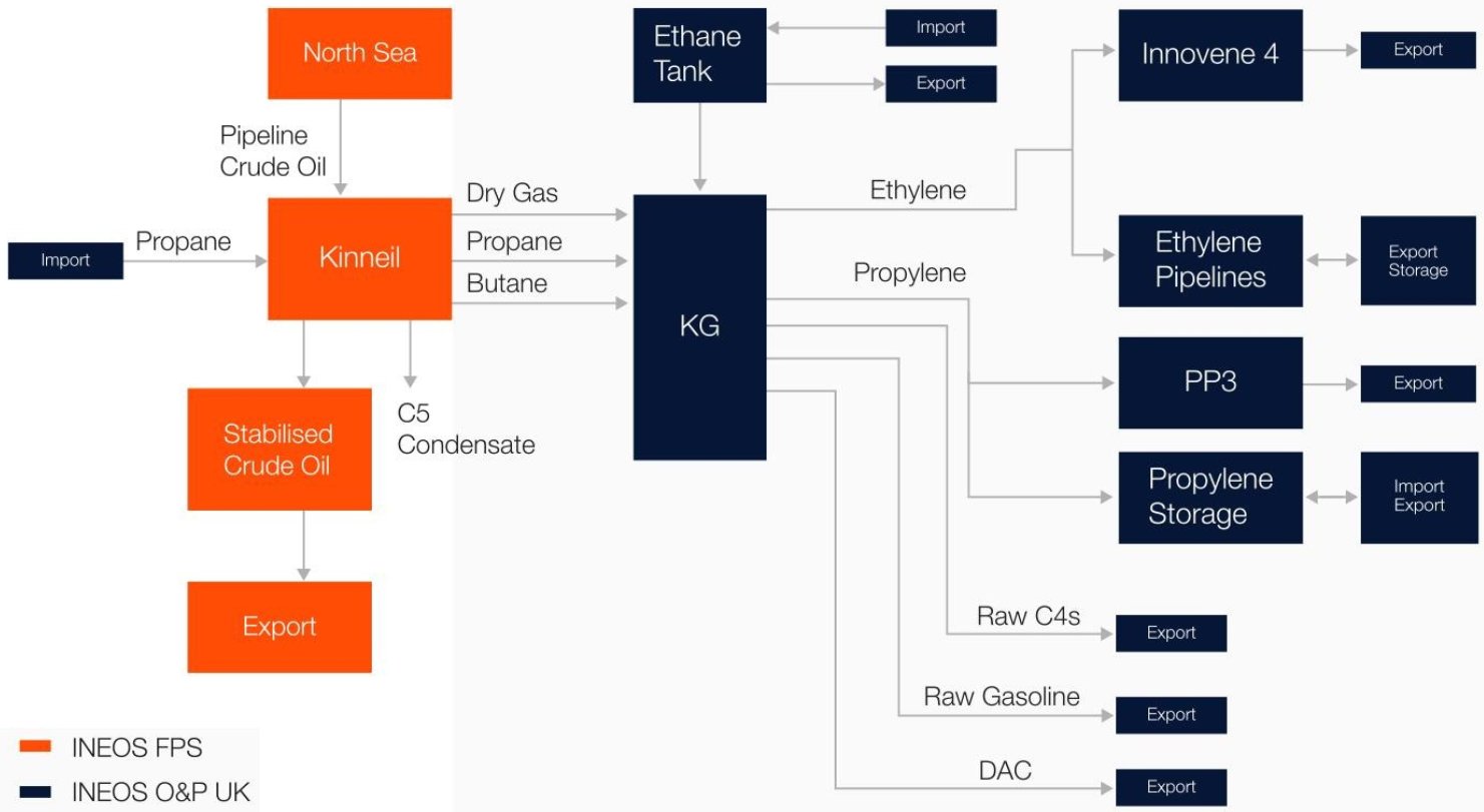 Grangemouth complex integrated flows of raw materials and finished products across the O&P UK business |